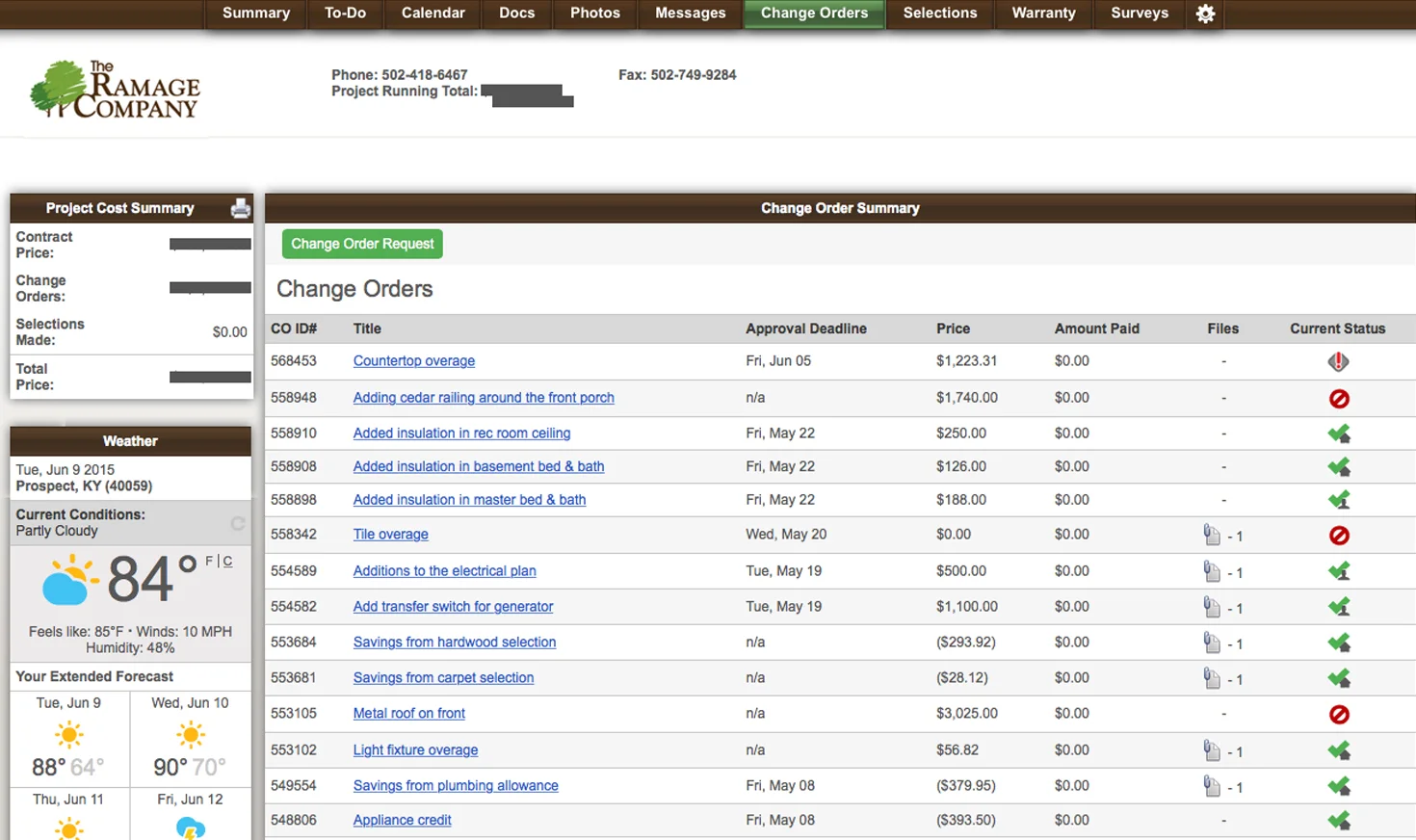 The Ramage Company offers a user-friendly, cloud-based production software allowing our clients to track, in real time, their production schedule, interior design selections, progress photos, change orders, credits and much more. Each client gets their own unique log-in credentials which personalizes their experience. Below are some sample images from our production software: